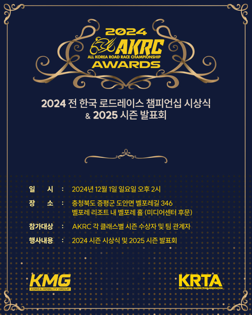 12월 1일, 충북 증평 벨포레 리조트에서 2024 AKRC(전 한국 로드레이스 챔피언십) 시상식 및 2025 시즌 발표회가 진행됐다. 전 한국 로드레이스 챔피언십은 KRTA(대한 로드레이싱 팀 협회)가 주관하고 KMG(코리아 모빌리티 그룹)이 주최하는 모터사이클 로드레이스다. 올해 AKRC는 총 5라운드로 치러졌으며, 슈퍼N클래스, ST300, SP300, SP500, SS600, ST1000 그리고 SB1000까지 총 7개의 클래스로 진행되었다.