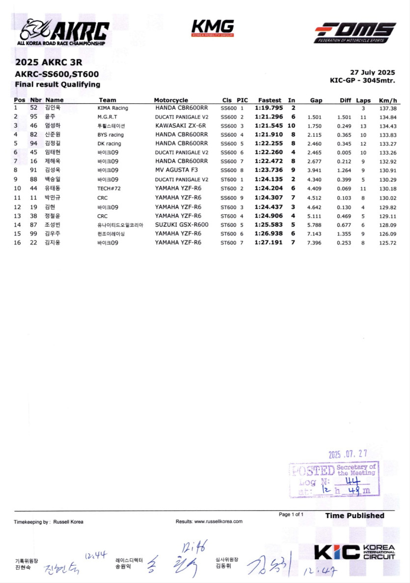 2025 AKRC Rd.3 SS600/ST600 예선 기록지입니다.