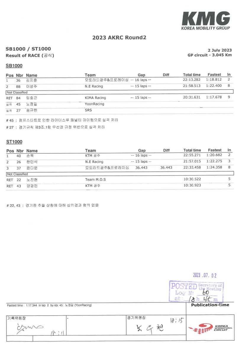 2023 AKRC Rd.2 SB1000&ST1000 결승 기록지