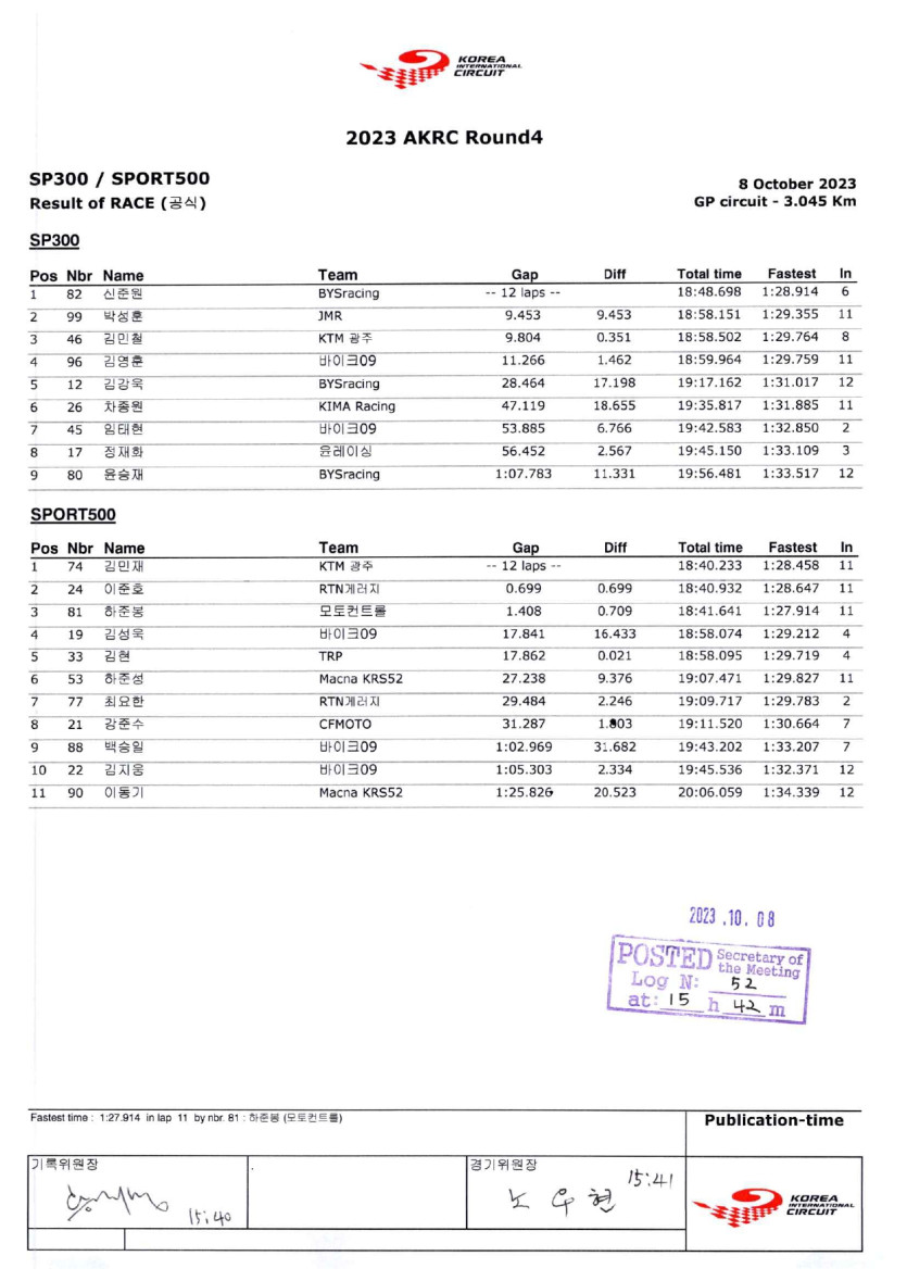 2023 AKRC Rd.4 SP300&SPORT500 결승 기록지