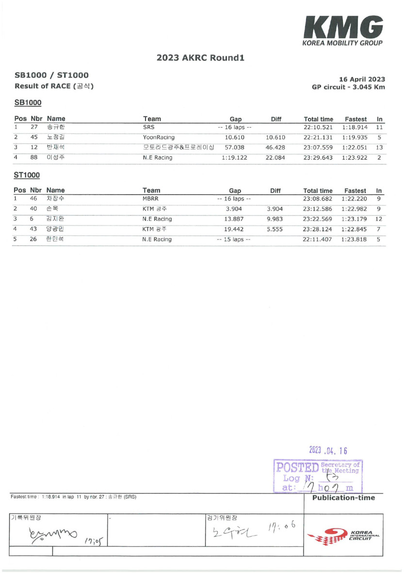 2023 AKRC Rd.1 SB1000 & ST1000 결승 기록지