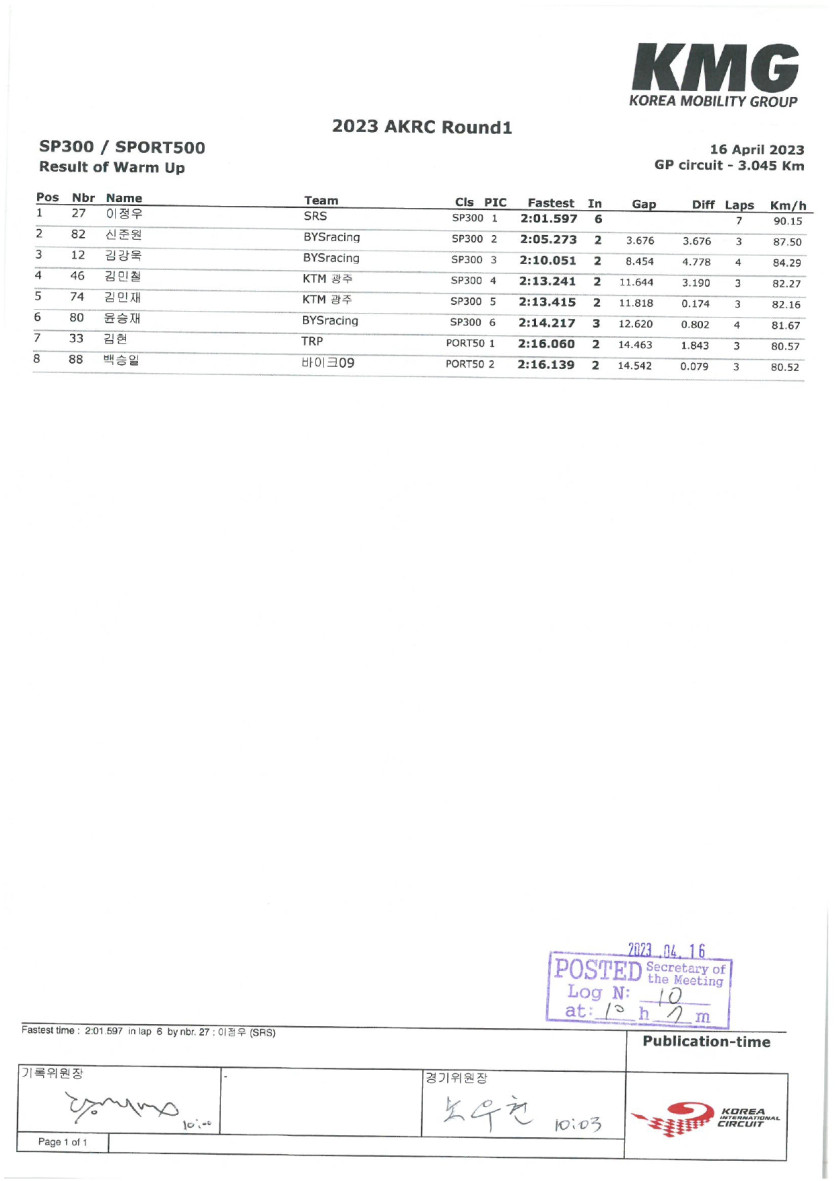 2023 AKRC Rd.1 SP300 & SPORT500 연습 기록지 > 대회 결과 (Race Result)