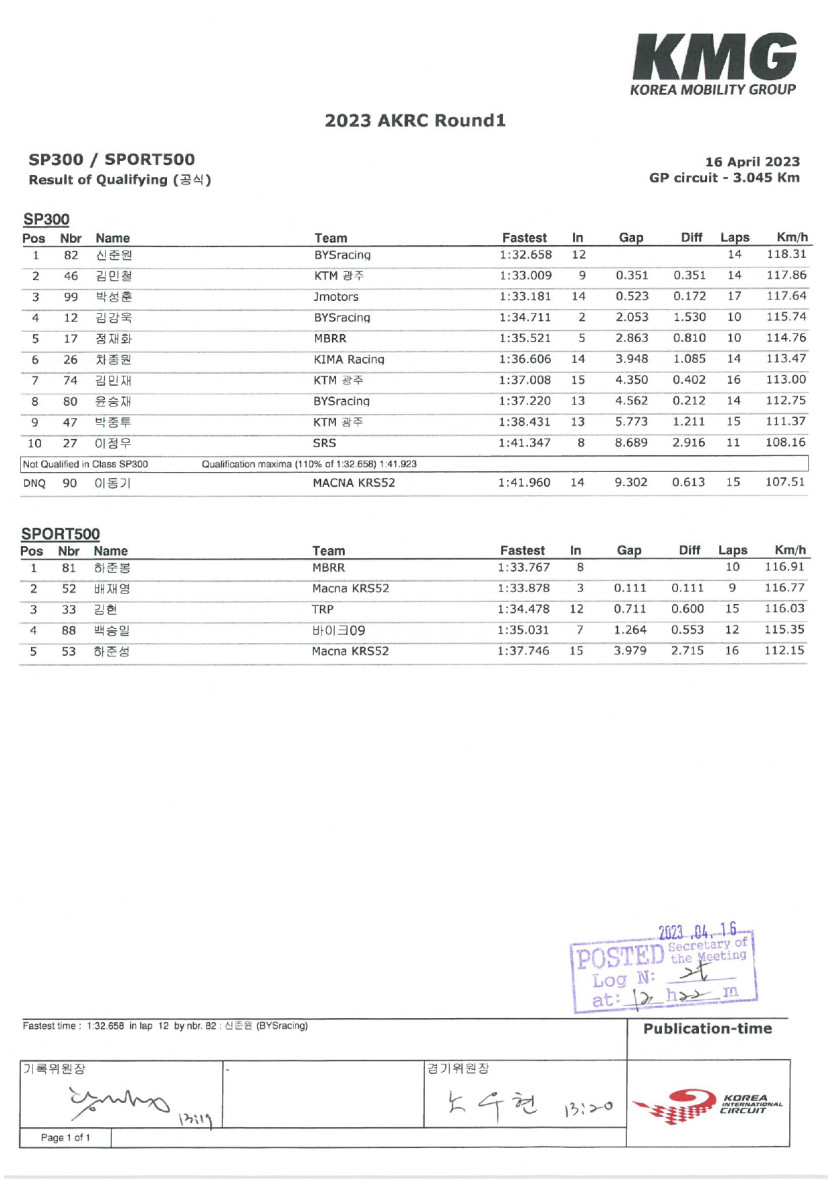 2023 AKRC Rd.1 SP300 & SPORT500 예선 기록지